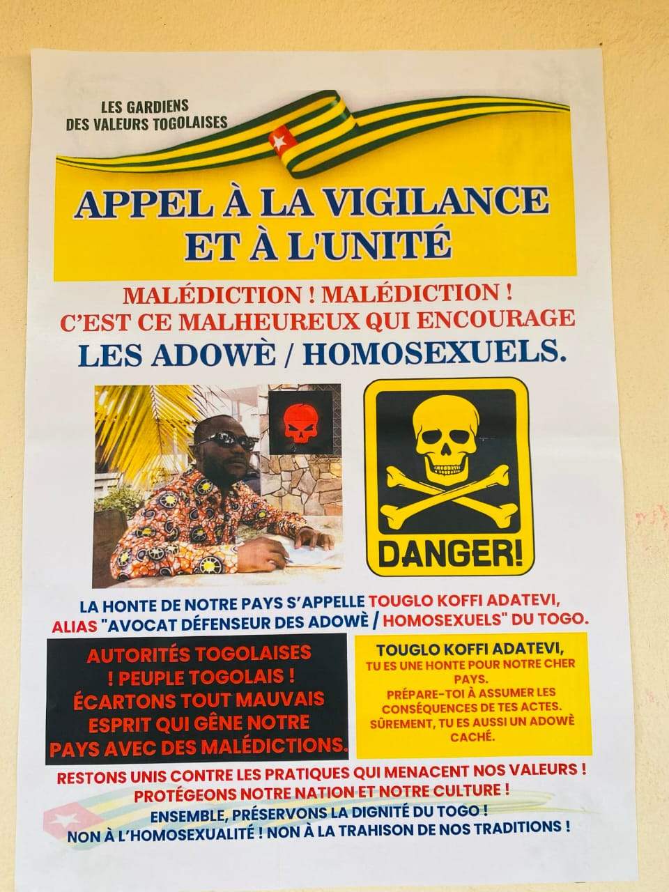 Depuis quelques jours, des affiches portant l’inscription "  <<Malédiction ! Malédiction !  Avocat défenseur des Adowé/ homosexuels alias TOUGLO Koffi Adatevi>> sont apparues sur certaines artères des rues et murs de Lomé. On peut y lire des propos dénonçant cet homme, présenté comme un "avocat défenseur des minorités LGBT ( Homosexuel ou Adowè) , et appelant le gouvernement et la population à des actions concrètes contre lui.